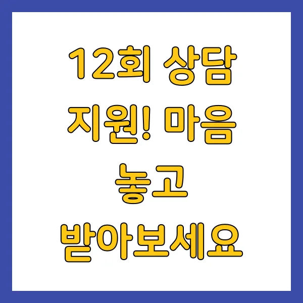 1인당 최대 12회 상담을 지원받을 수 있으며, 1회 상담 비용은 약 6만원 상당입니다. 정부 지원 덕분에 본인 부담금은 회당 1만원 이하! 경제적 부담 없이 마음껏 상담받을 수 있는 절호의 기회입니다.